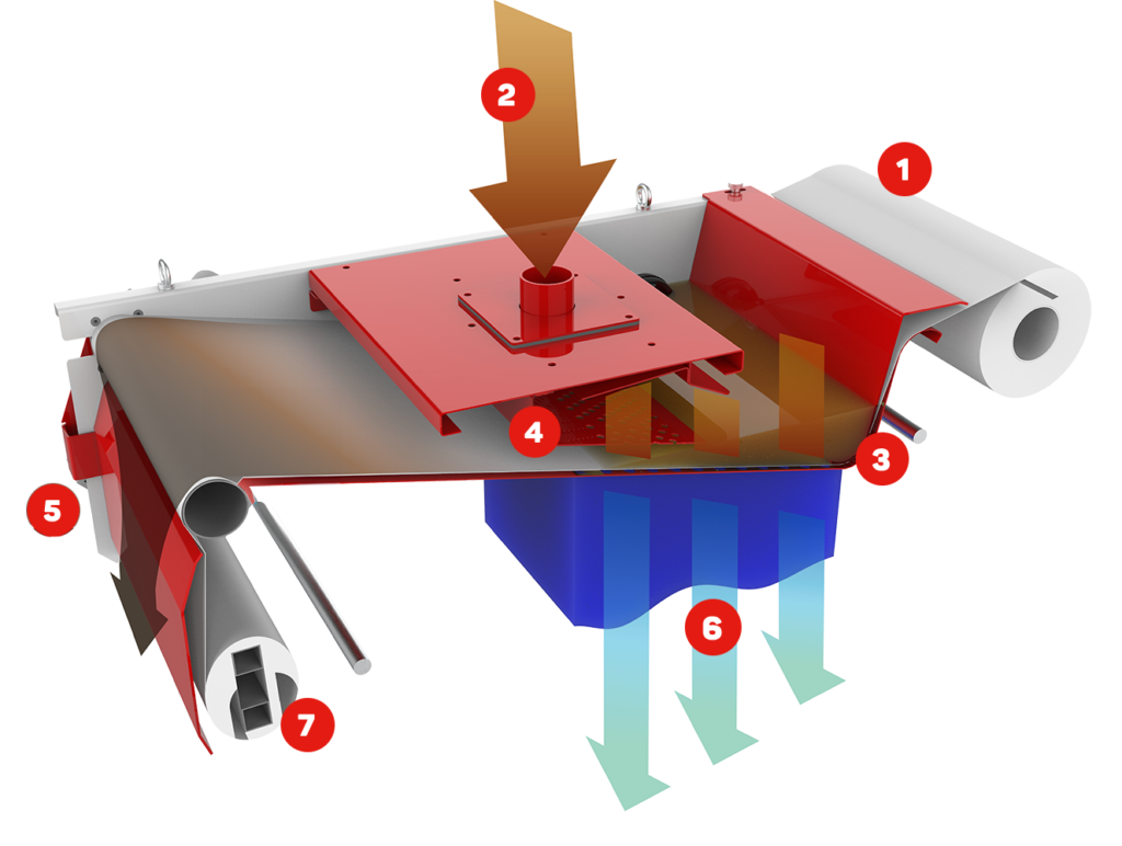 When the fabric is clogged, a float activates a switch (4) that signals total filter clogging. This starts the gear motor to drive the filter fabric (5), replacing the exhausted portion of fabric with clean fabric (1). The exhausted fabric is scraped and rewound (7), facilitating waste separation and reducing maintenance time and disposal costs.